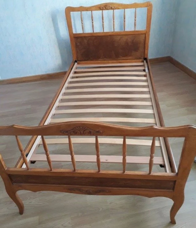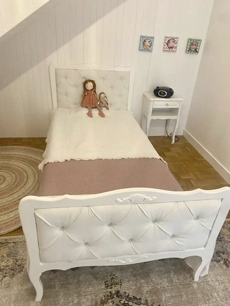 Avant / Après — restauration artisanale d’une tête de lit pour enfant.