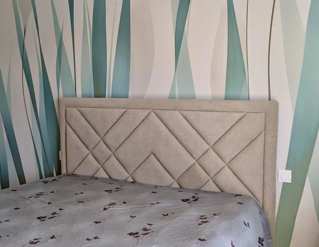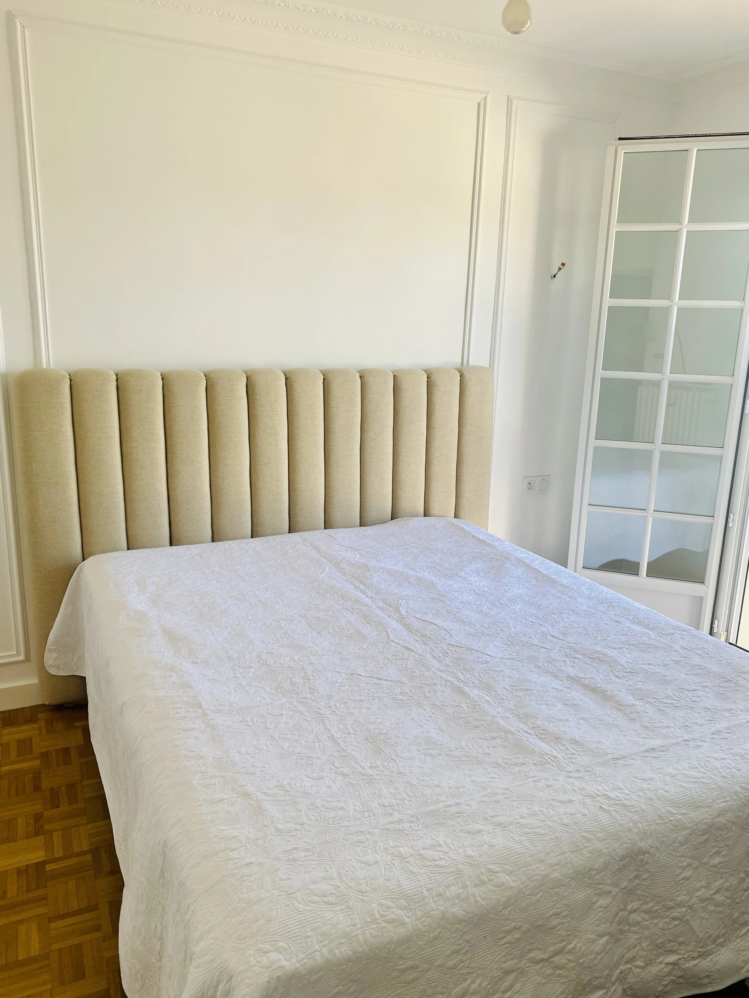 Tête de lit réalisée sur mesure en velours, dans une teinte claire et douce.