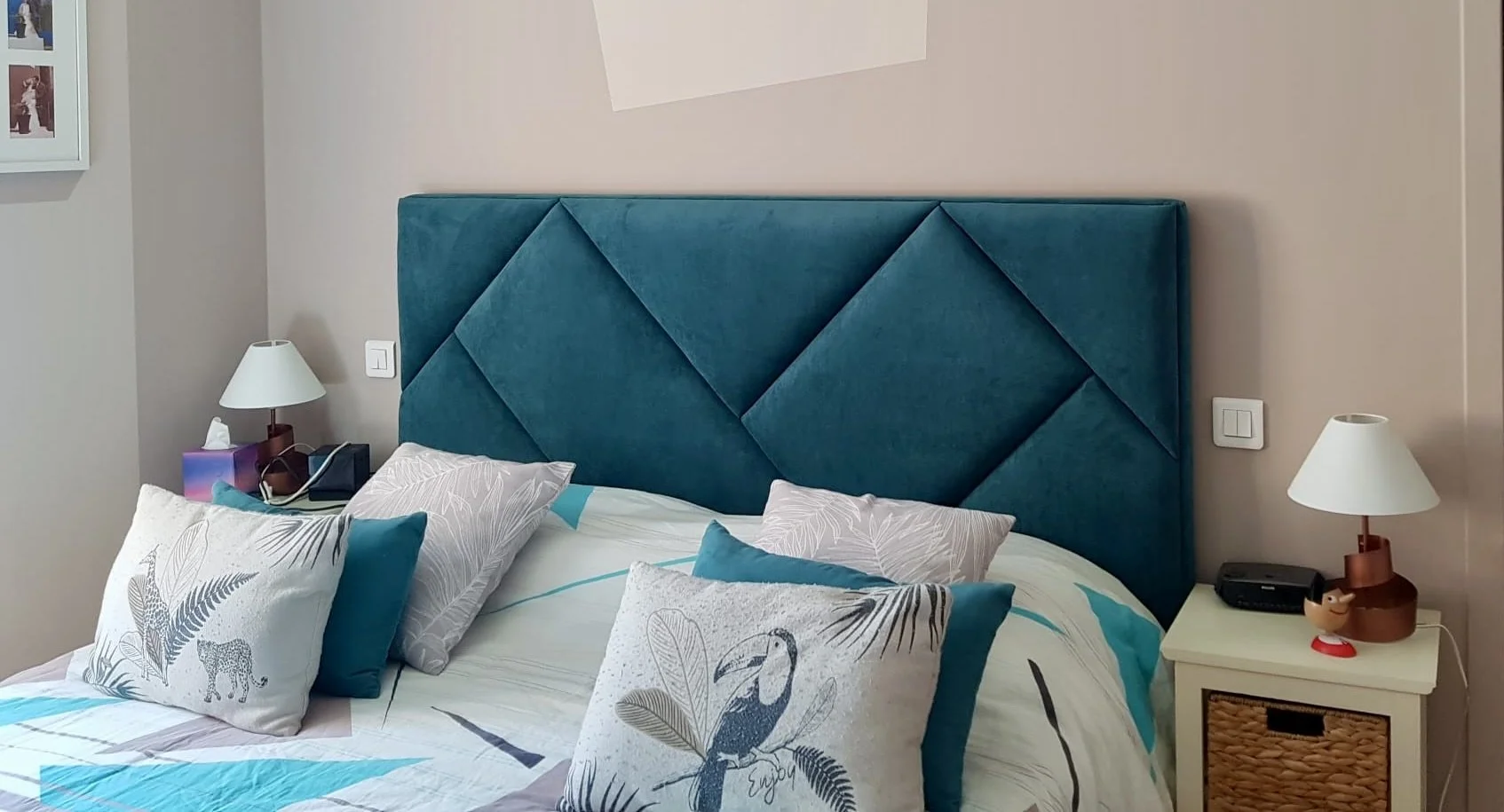 Tête de lit sur mesure en velours bleu turquoise, aux lignes géométriques.